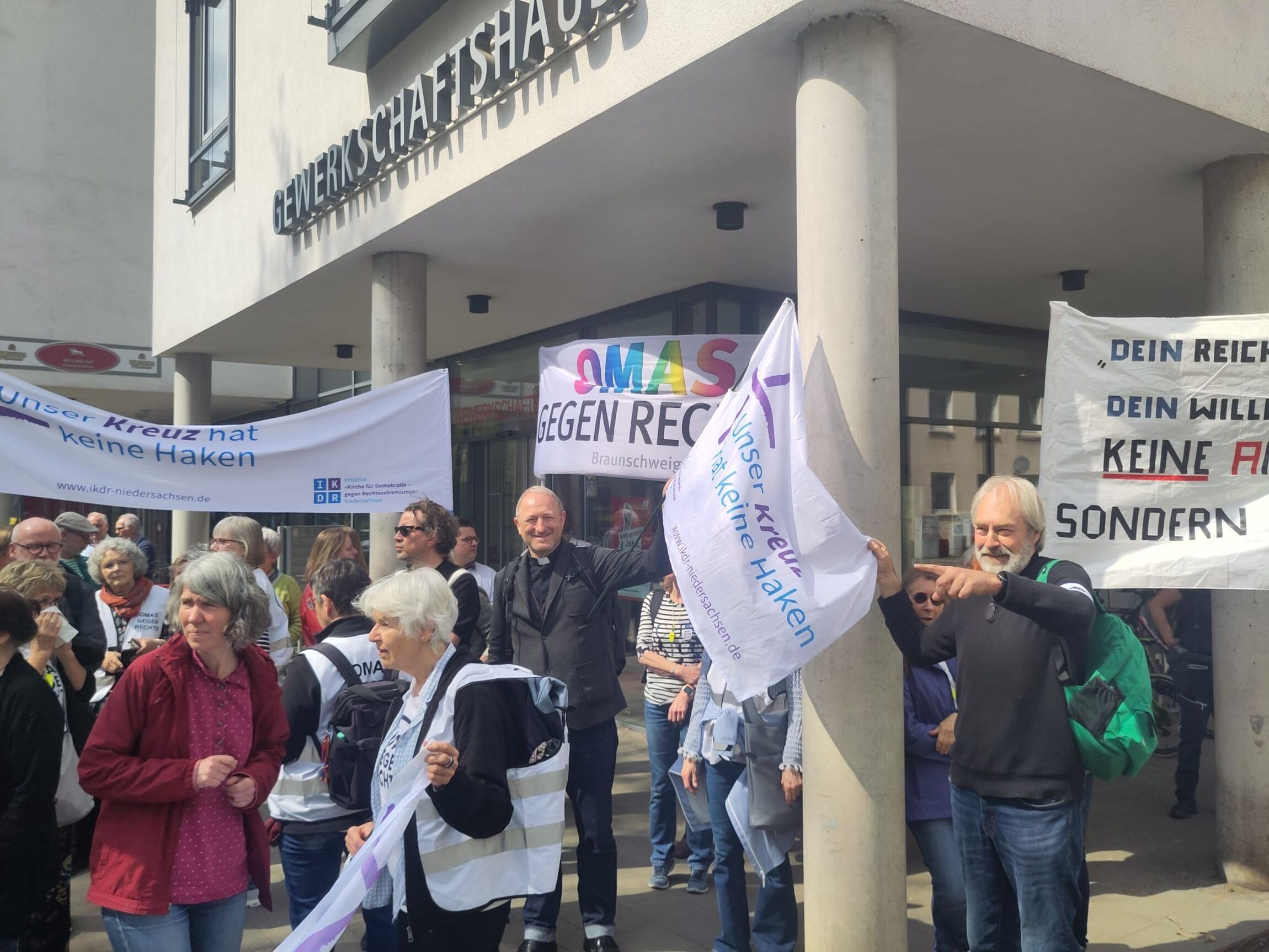 Nach der Hauptkundgebung am Schloss in Braunschweig beziehen Kirche, Gewerkschaften und die Omas gegen Rechts vor dem Gewerkschaftshaus Position für Demokratie und setzen ein sichtbares und lautes Zeichen gegen den Marsch von Reichsbürgern in den Straßen unserer Stadt. „Wir wollen nicht zurück in dunkelbraune Zeiten und auch nicht zurück ins Kaiserreich. Wenn wir als Kirche von einem Reich sprechen, dann ist es kein weltliches Reich. Kein Reich der autoritären Macht der Starken, die die vermeintlich Schwachen unterwerfen. Kein Reich, das durch militärische Gewalt errichtet wird. Kein Reich das käuflich wäre. Vielmehr halten wir an der alten Verheißung fest, dass am Ende Gottes Reich anbrechen wird. Ein Reich der Versöhnung. Ein Reich ohne Kummer, ohne Neid, ohne Leid, ohne Tod. Ein Reich des Lebens aus der Fülle. Ein Friedensreich.“, so Lars Dedekind, Propst in Braunschweig und Vorsitzender des Sprecher*Innerstes der IKDR Niedersachsen. Die Fahnen der Initiative Kirche für Demokratie und gegen Rechtsextremismus sind heute überall gut sichtbar mit der klaren Aussage: „Unser Kreuz hat keine Haken“!